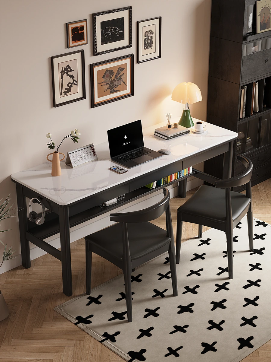 Modern Minimalist Solid Wood Double Work Desk - Black Luxury Rock Surface Computer Table for Home Office, Long Rectangular Writing Station