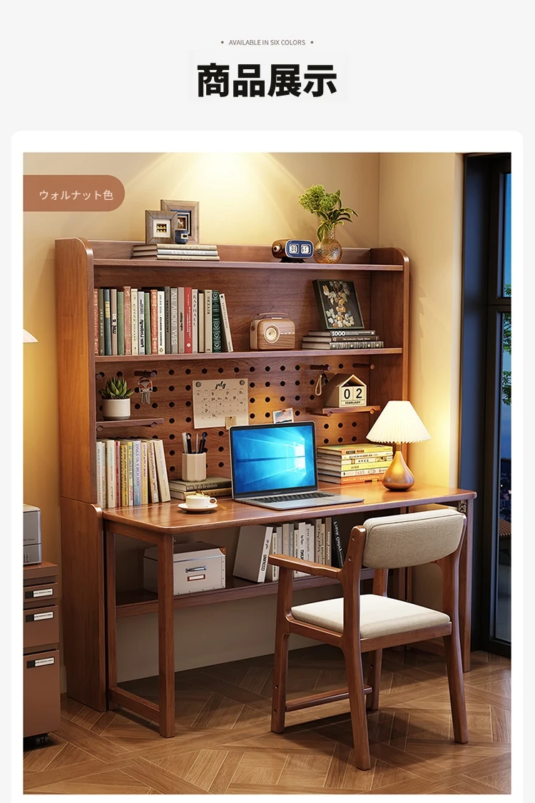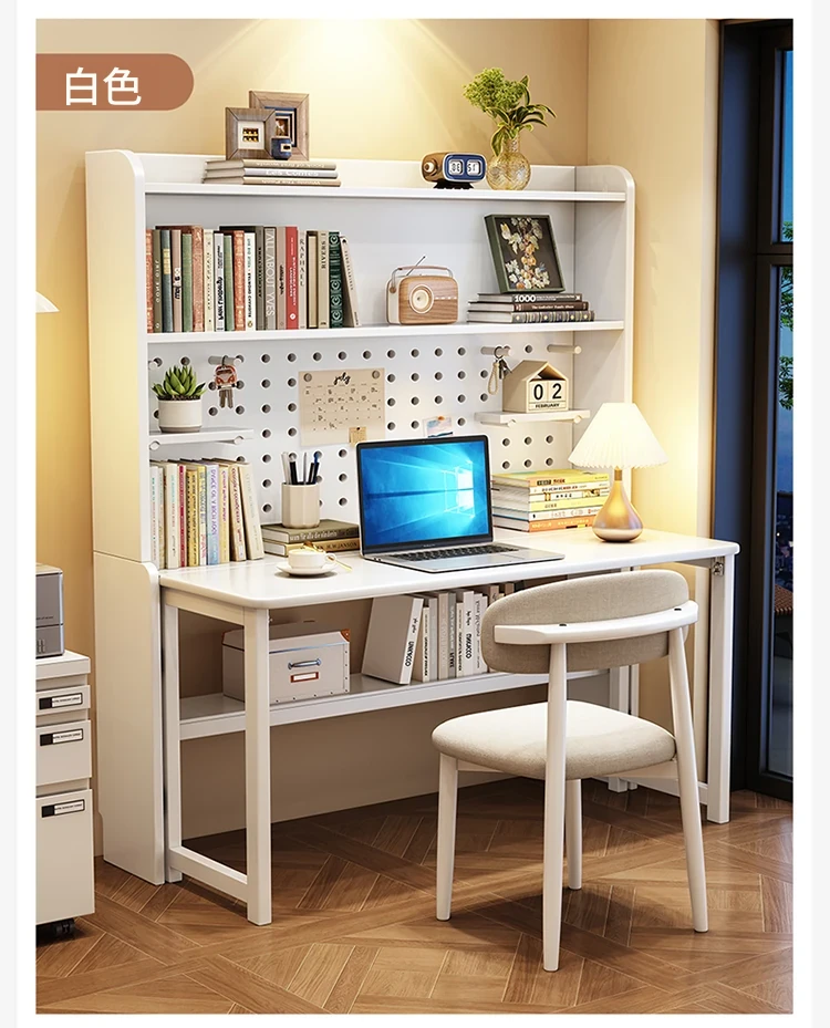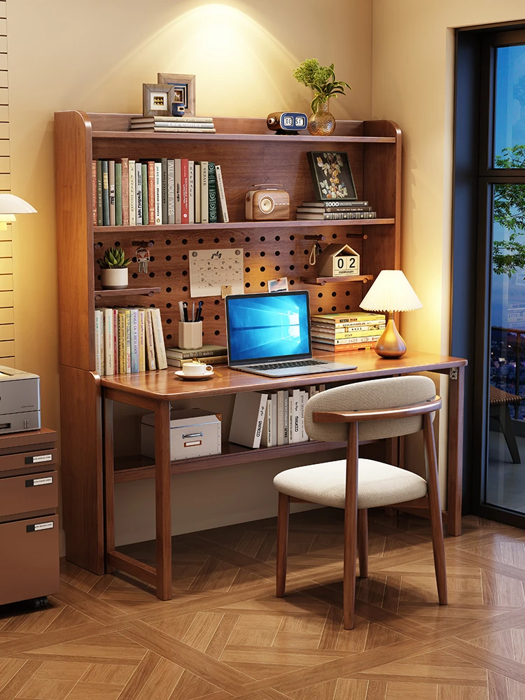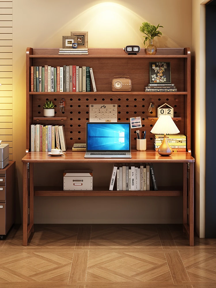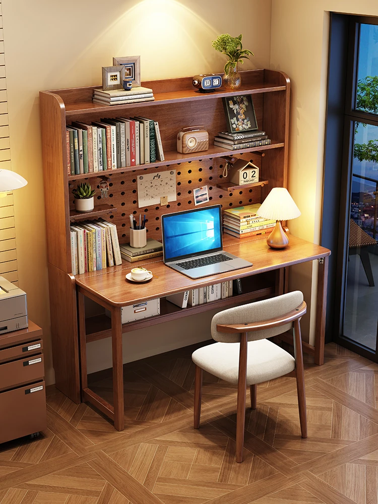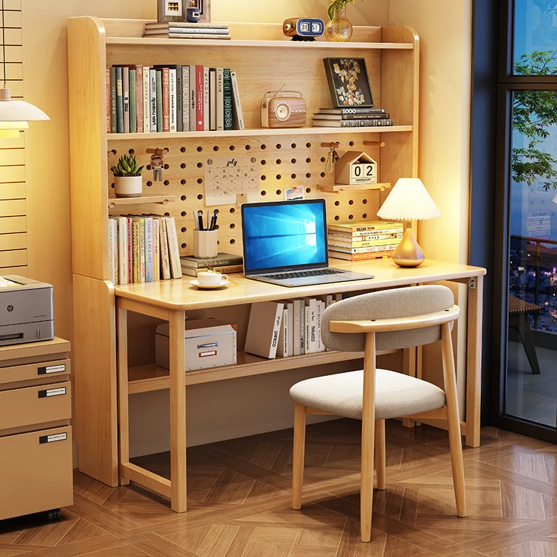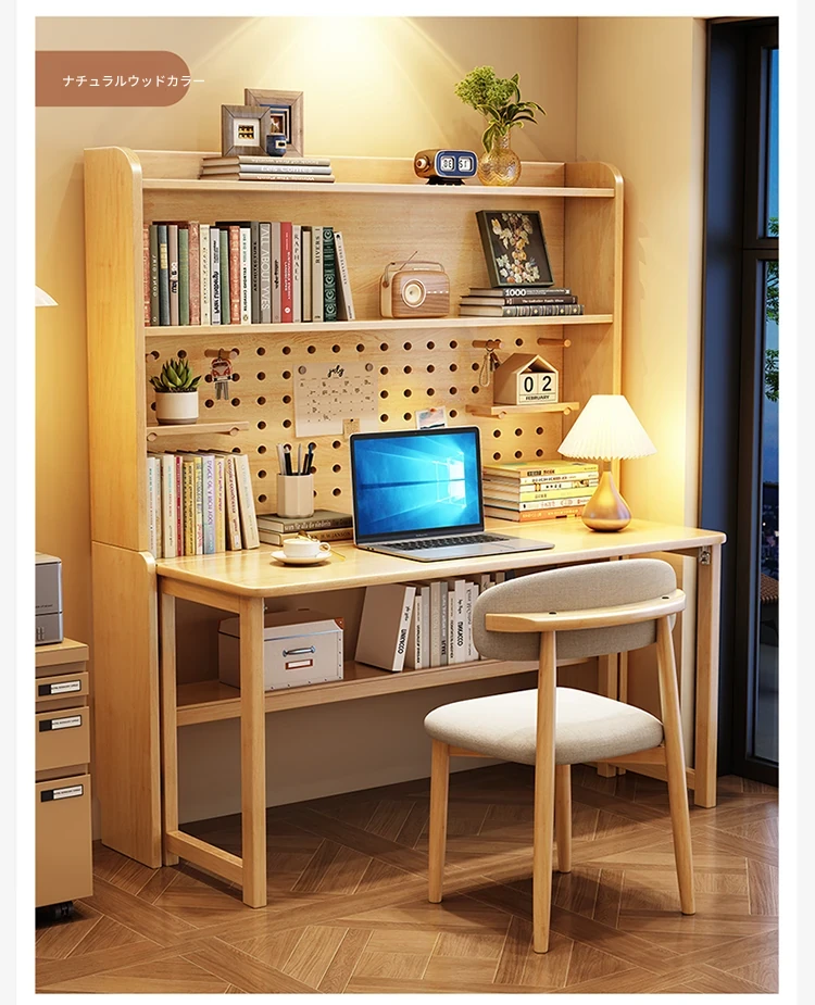 北欧スタイルの無垢材デスク&シェルフ一体型、折りたたみ伸縮式パソコンデスク - 学生向け、家庭用、使いやすい穴あけボード付き学習デスク