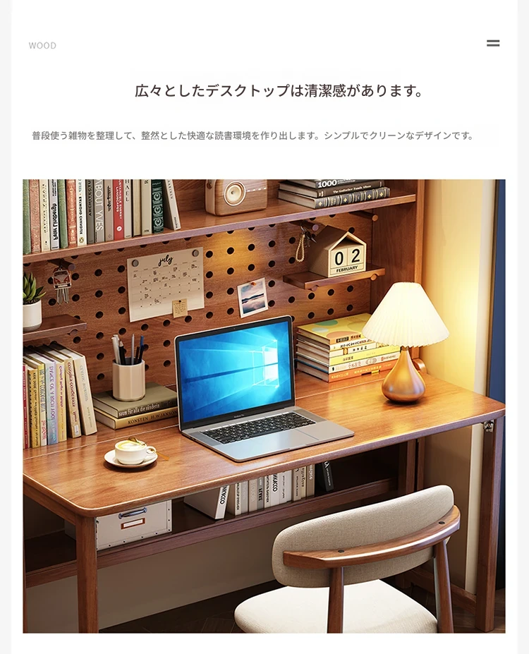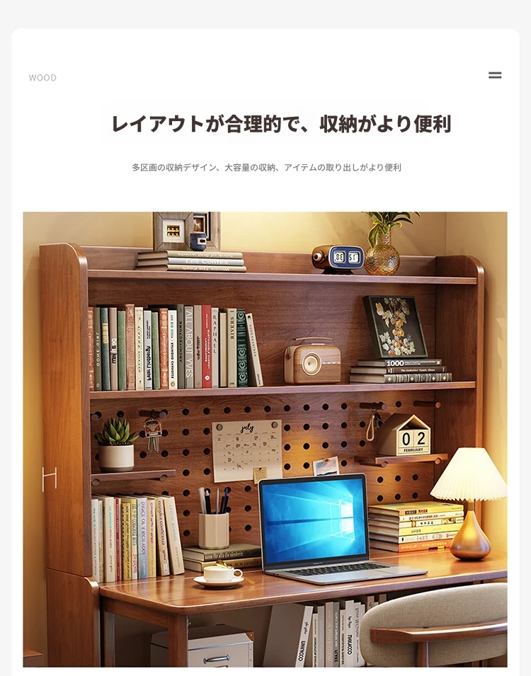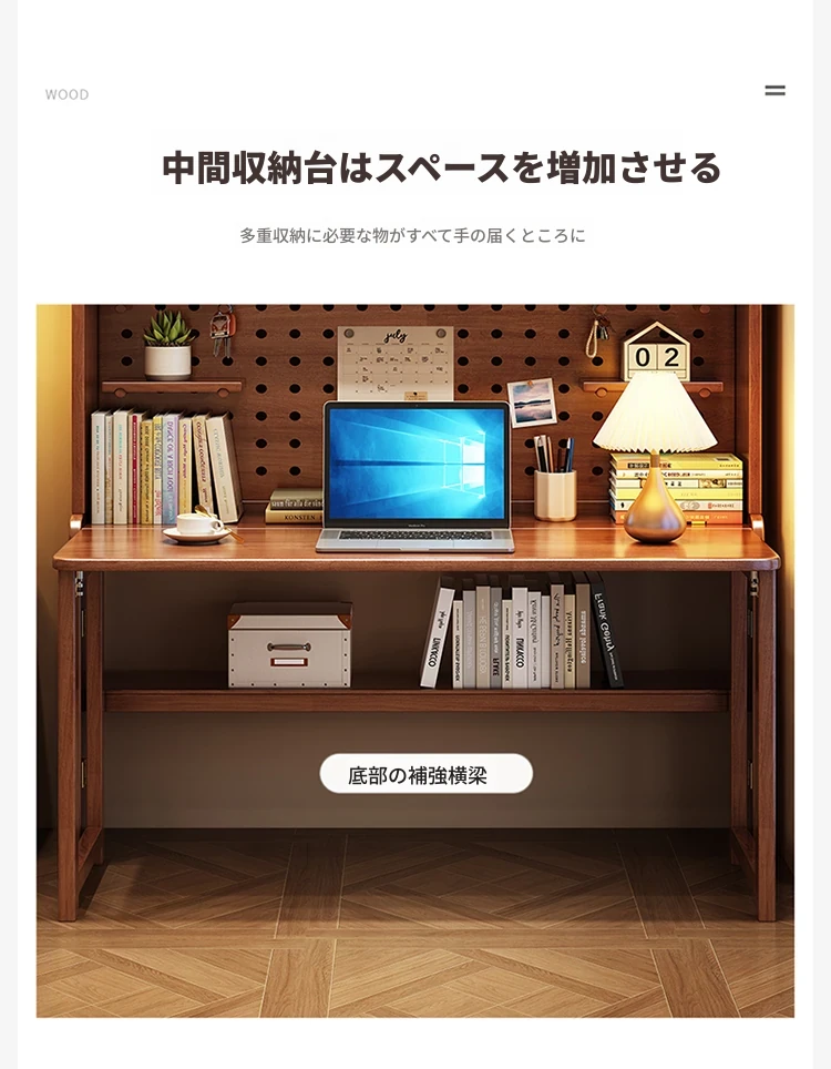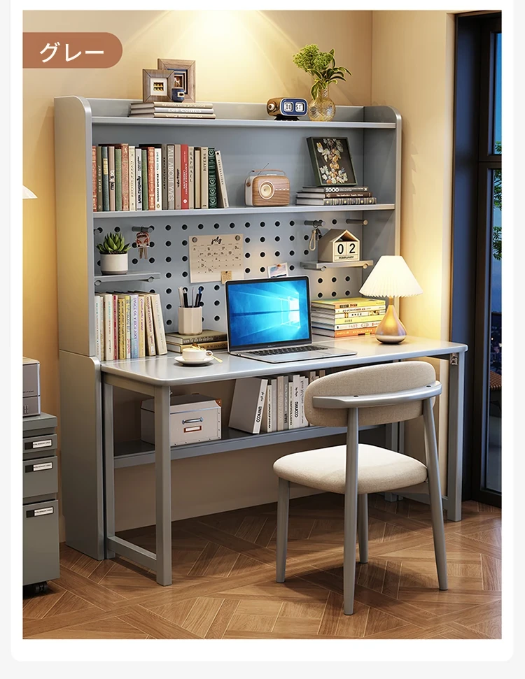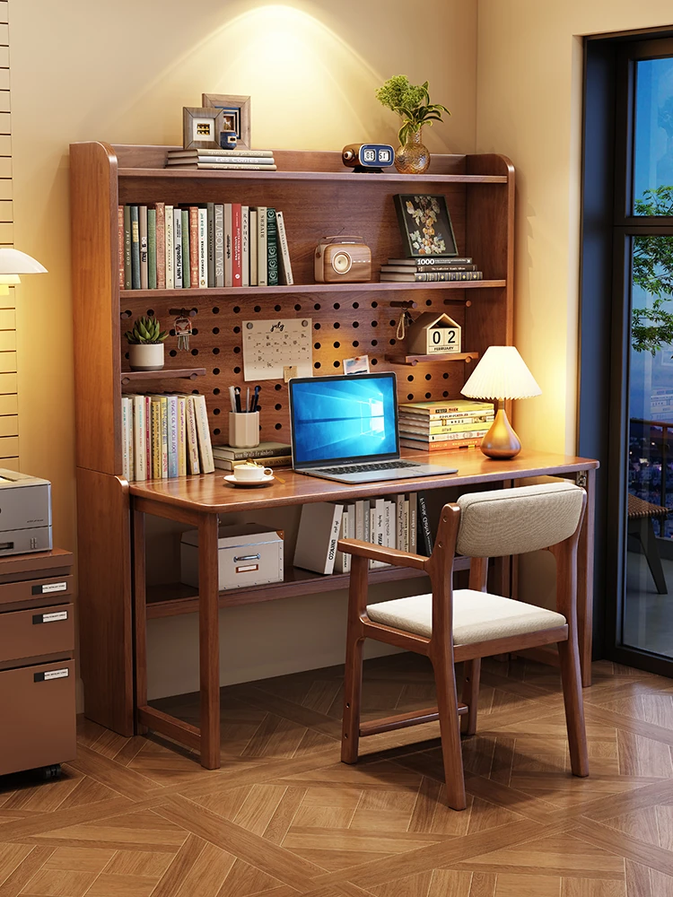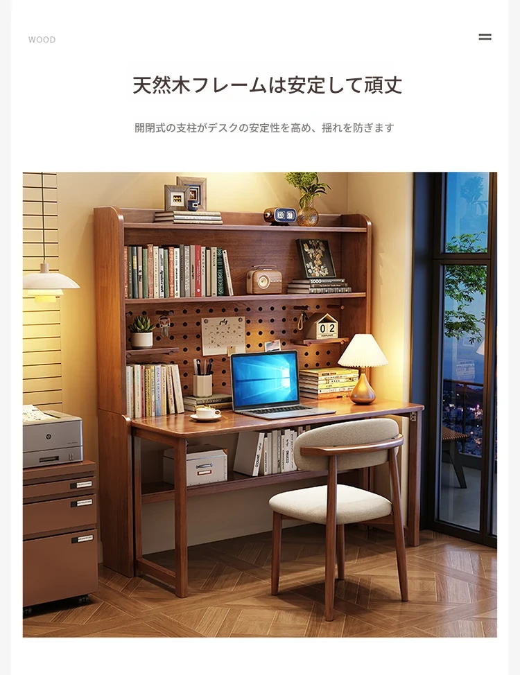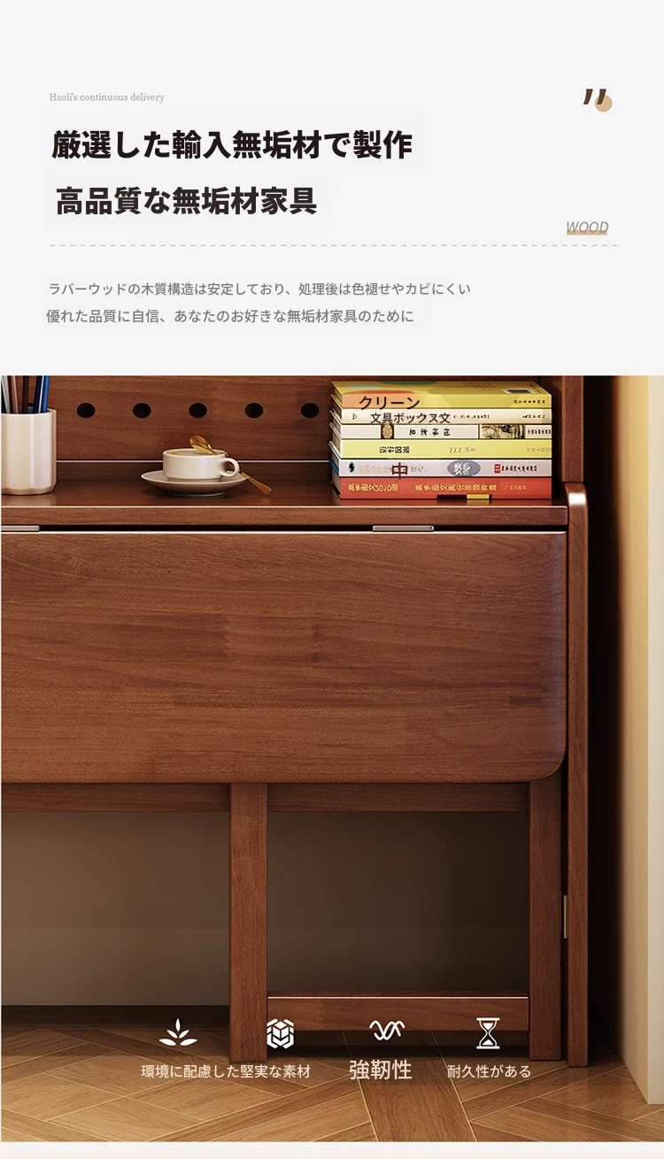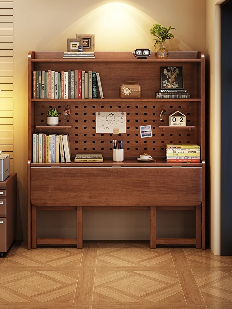 北欧スタイルの無垢材デスク&シェルフ一体型、折りたたみ伸縮式パソコンデスク - 学生向け、家庭用、使いやすい穴あけボード付き学習デスク