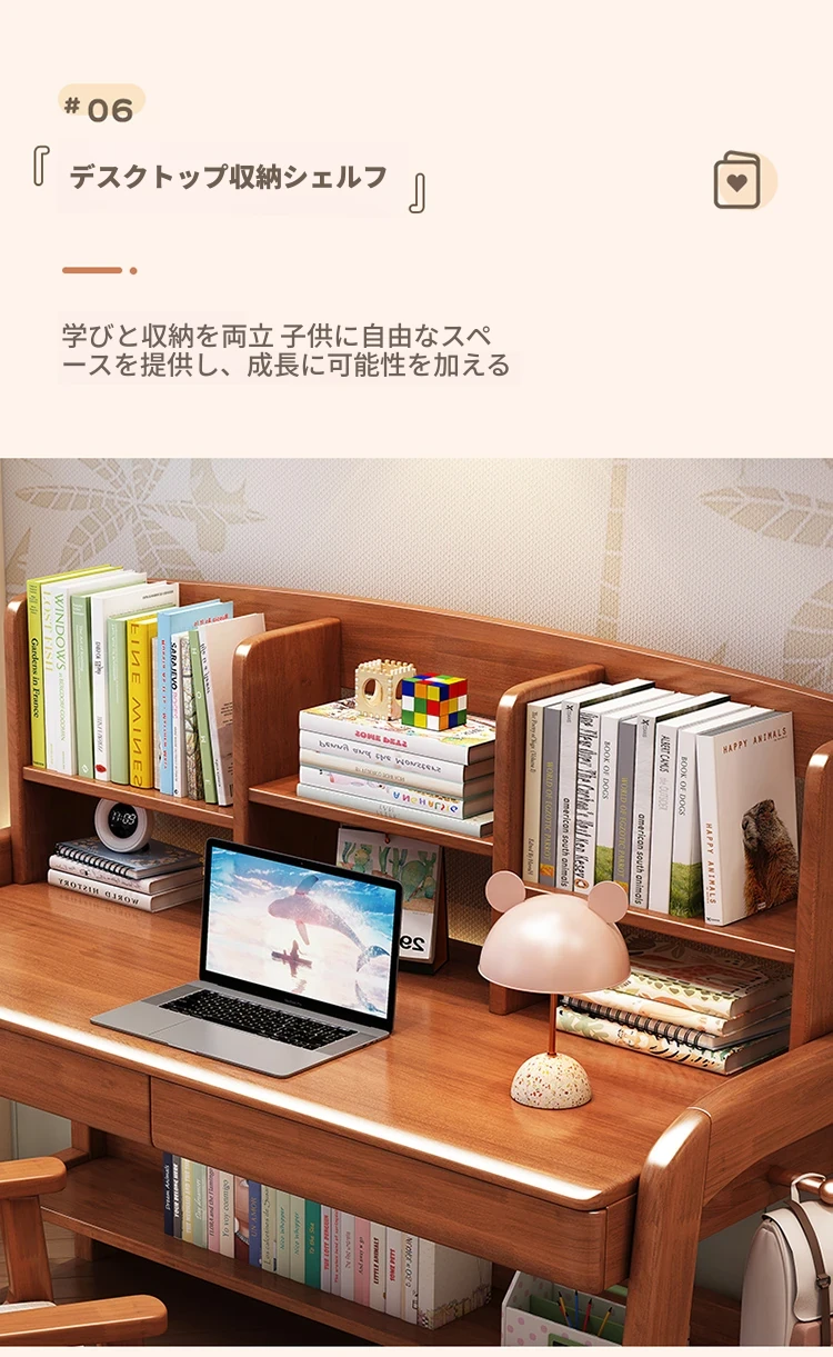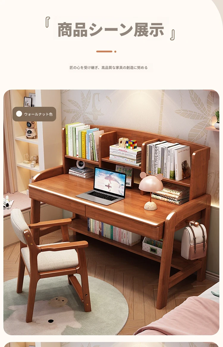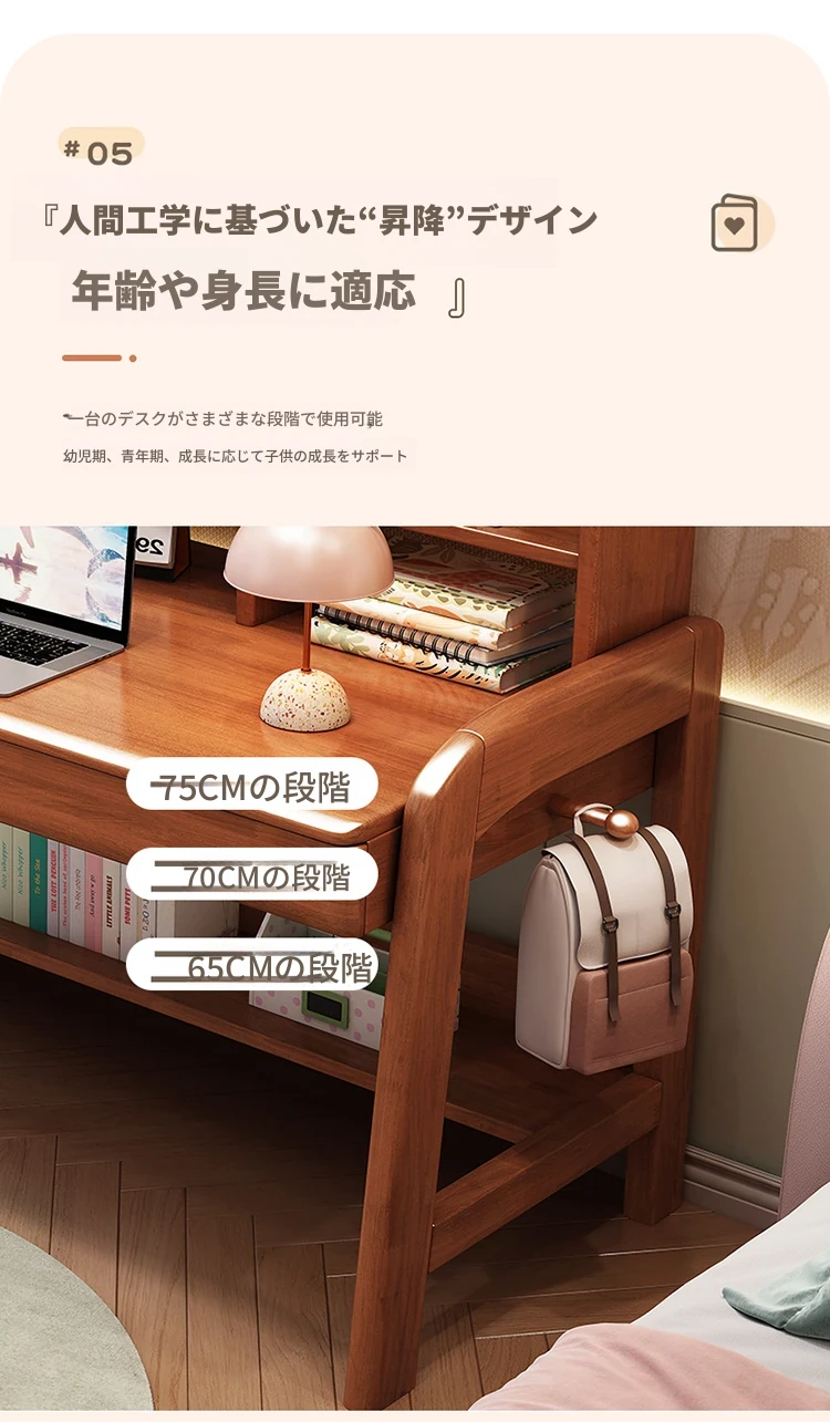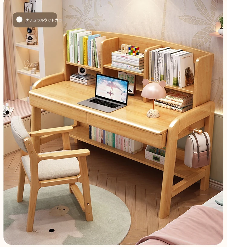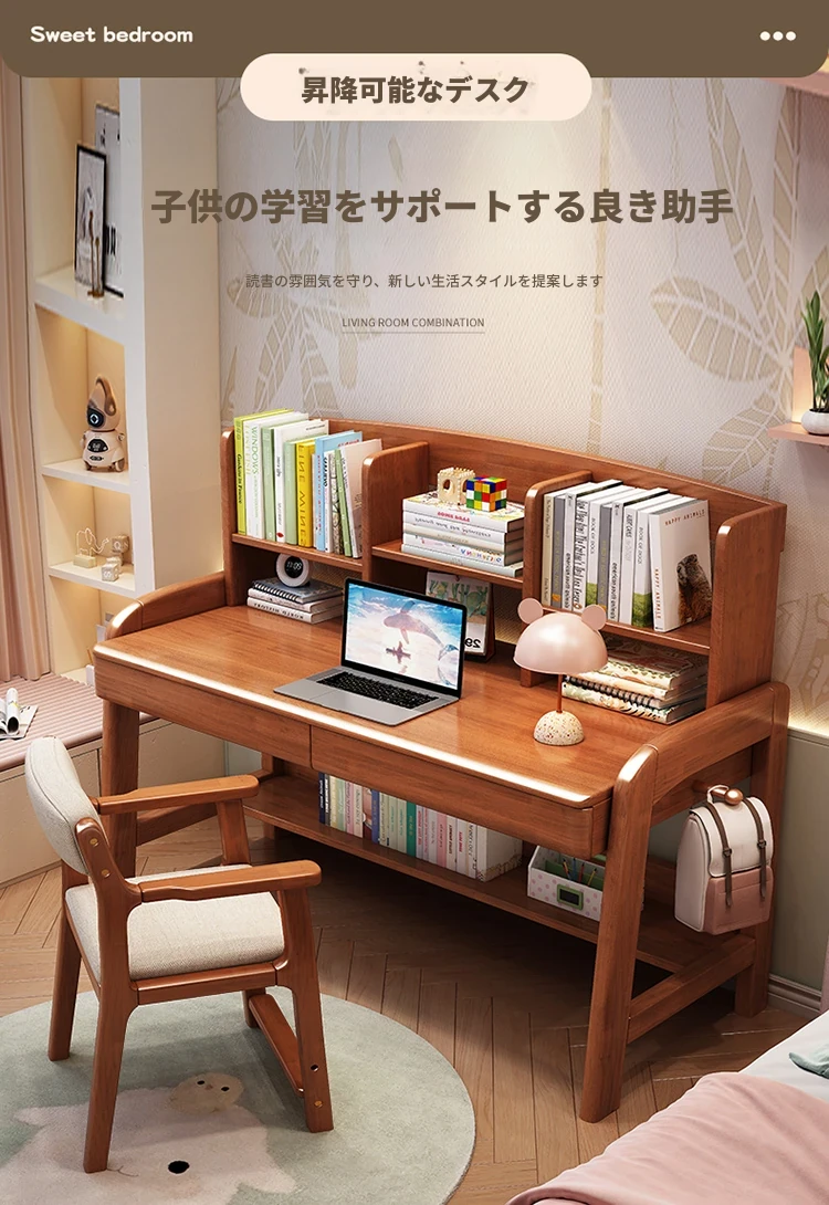 天然木製多機能学習デスク - 昇降機能付きで成長をサポート!家庭やオフィスに最適なパソコンデスク、子供から高校生まで対応可能な書棚一体型デザイン