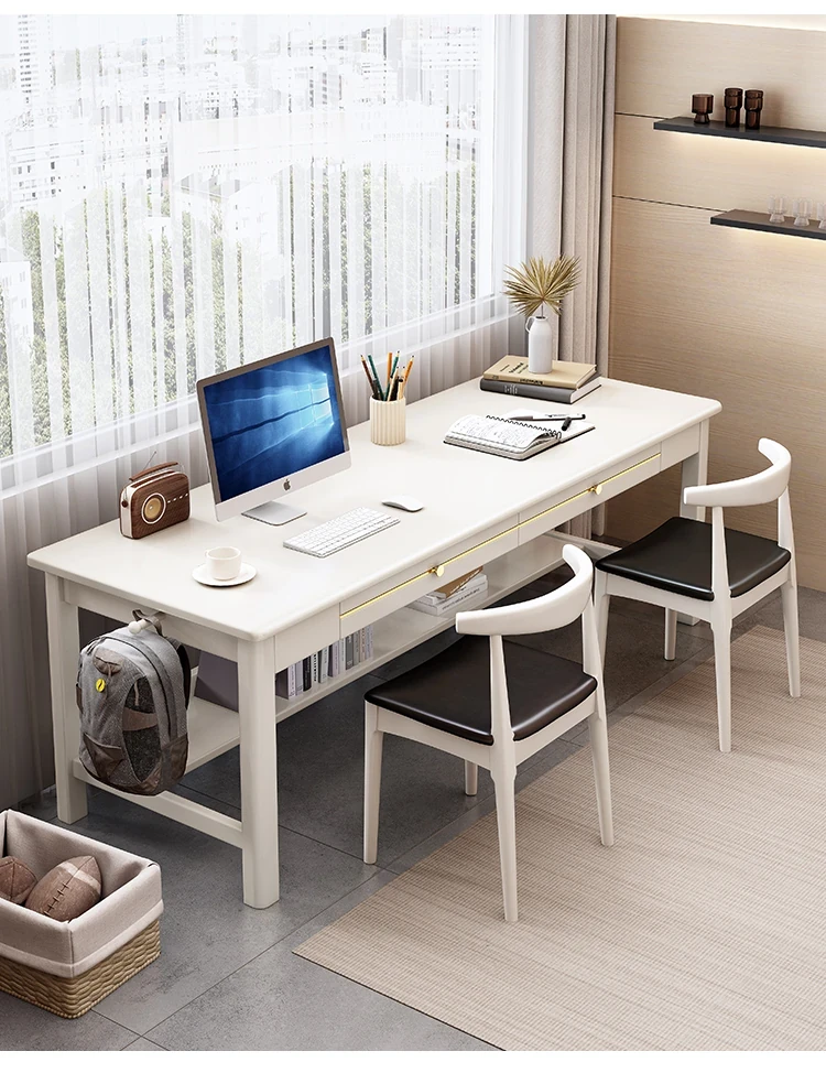 多機能デザイン!自宅でもオフィスでも活躍する天然木製ダブルデスクセット-シンプルでおしゃれ、壁際でスペース活用抜群。【快適な学習と仕事環境を実現】