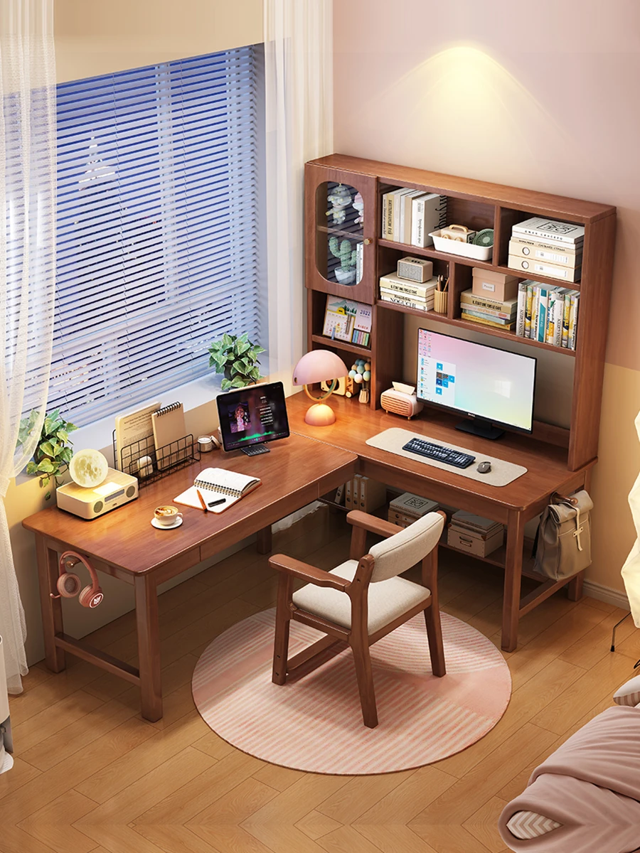 本格派!多機能L字型天然木材デスク&シェルフセット:勉強、仕事、収納を一体化した完璧なホームオフィスソリューション