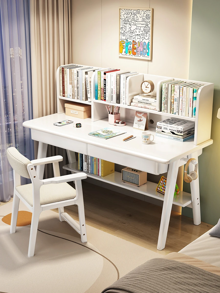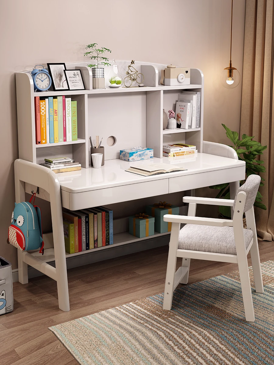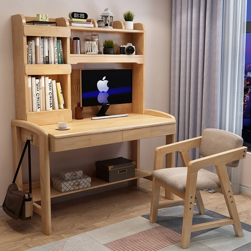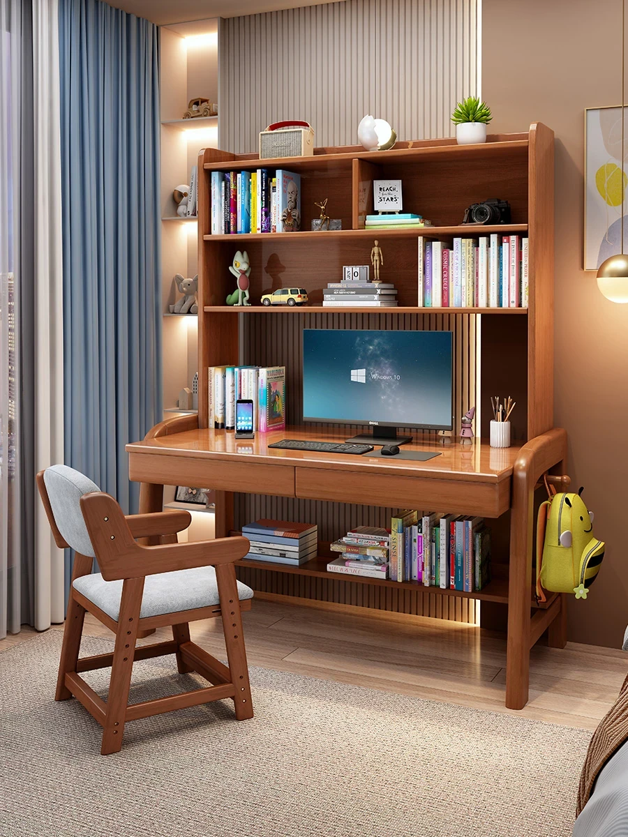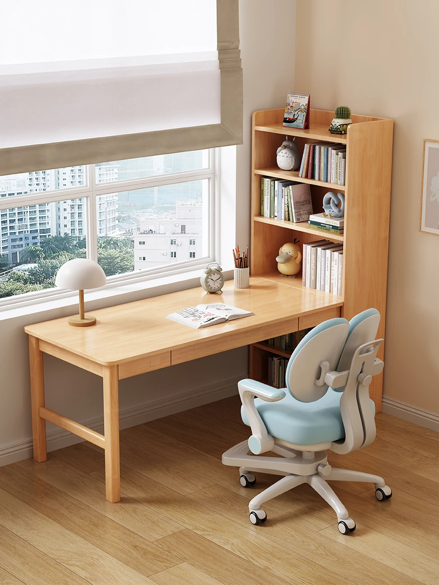 お子様向け学習机:家用・宿題・書き物デスク!高さ調整可能な天然木製デスクに本棚一体型、コンピュータデスクにも最適!