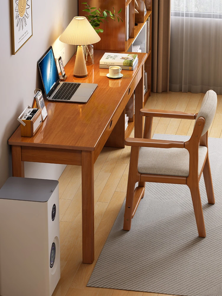 天然木製ワイドデスク - 引き出し付き、家庭用オフィスやリビングに最適!書斎やダイニングテーブルとしても大活躍、多人数が集える学習デスク。
