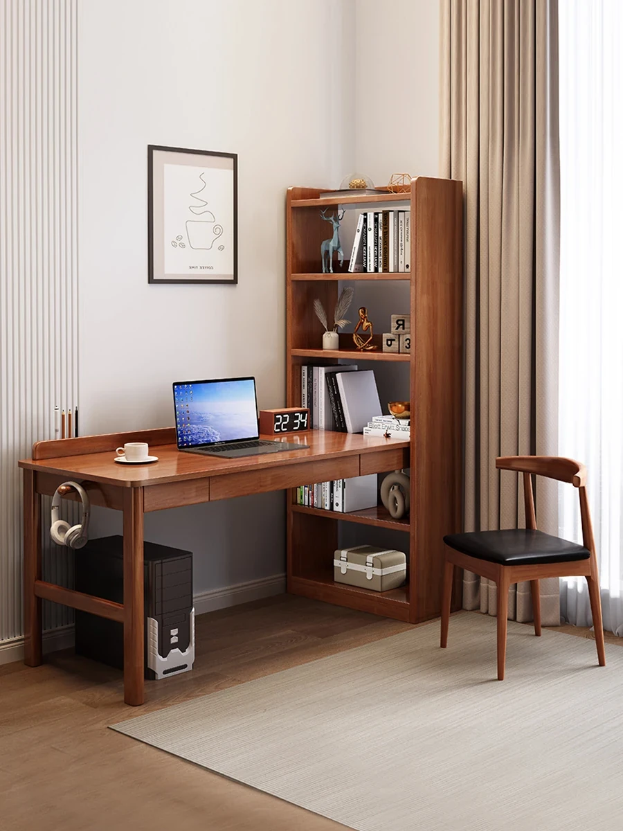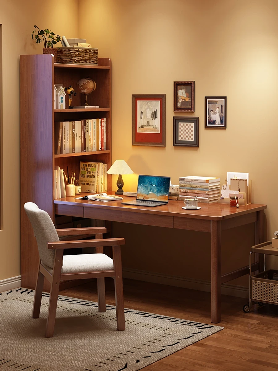 窓際魅力!多機能コーナーデザインの家庭用書斎デスクセット - 高品質の無垢材使用、書棚と書庫一体型パソコンデスク!