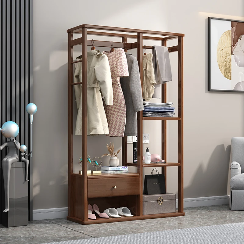 座れる天然木製ハンガーラック:抽屉付き多機能デザイン!シンプルモダンな衣類収納ソリューション。寝室やリビングルームに最適な便利でおしゃれなスタンド。